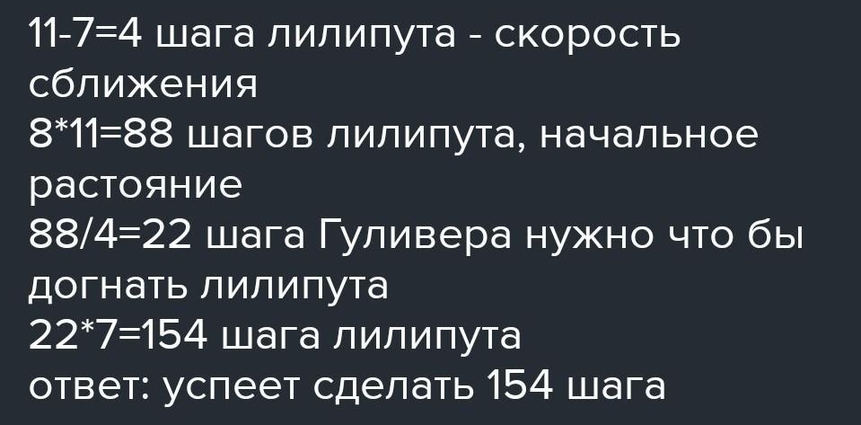 Гулливер погнался за лилипутом, когда расстояние между ними было равно 8 шагам Гулливера. Пока Гулливер делает 1 шаг , лилипут пробегает 7 шагов, но 1 шаг Гулливера равен 11 шагам лилипута. Сколько шагов пробежал лилипут до момента, когда Гулливер его догнал?