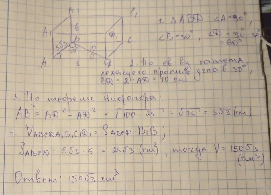 В прямоугольном параллелепипеде ABCD A1B1C1D1; ∠ABD=30°; BB1=6см; AD=5см. Вычисли объём.