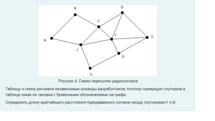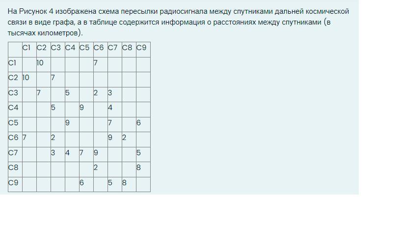 На Рисунке изображена схема пересылки радиосигнала между спутниками дальней космической связи в виде графа, а в таблице содержится информация о расстояниях между спутниками