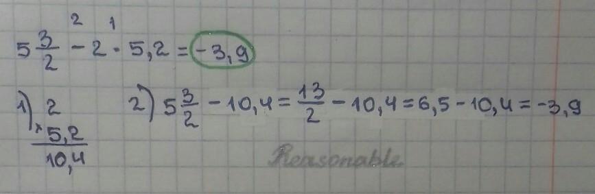 2) 5. 3/2 - 10,4 = 13/2 - 10,4 = 6,5 - 10,4 = -3,9