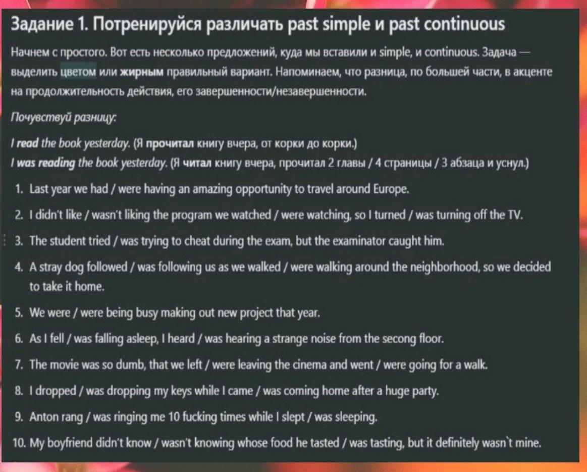 Помогите пожалуйста , нужно отличить где паст континиус и паст симпл✨❤️