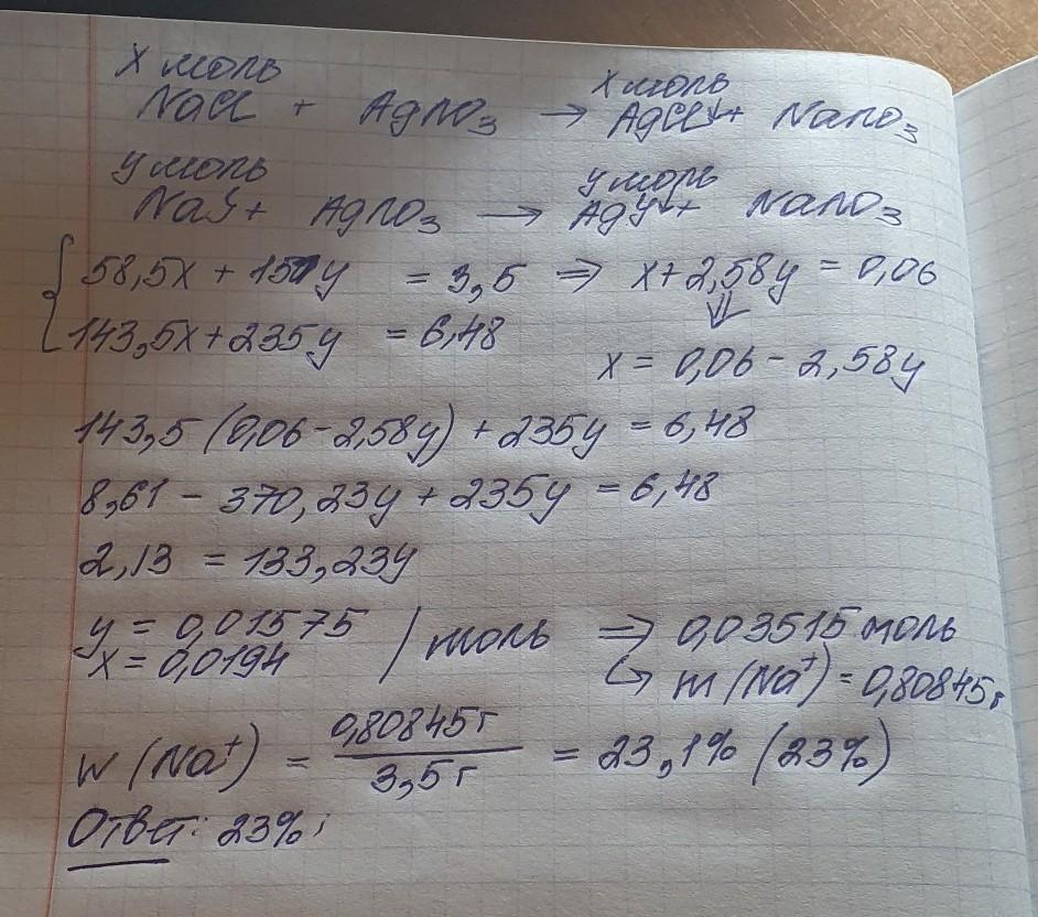 Для анализа смеси, состоящей из NaCl и NaI, провели следующие операции. Навеску смеси массой 3,50 г растворили в воде. К полученному раствору прибавили 68,0 г раствора нитрата серебра(I) с массовой долей AgNO_3 20%. Выпавший осадок отфильтровали, промыли, высушили и взвесили. Его масса оказалась равной 6,48 г. Вычислите массовую долю (%) ионов натрия в исходной смеси.