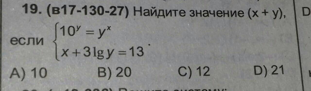 Ну, вообще-то, видно, что х=10 у=10 решение и надо выбрать ответ В)20