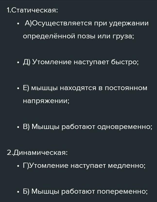 7. Установите соответствие между характеристикой работы мышц и видом работы. Ответ запишите в приведенную ниже таблицу.
