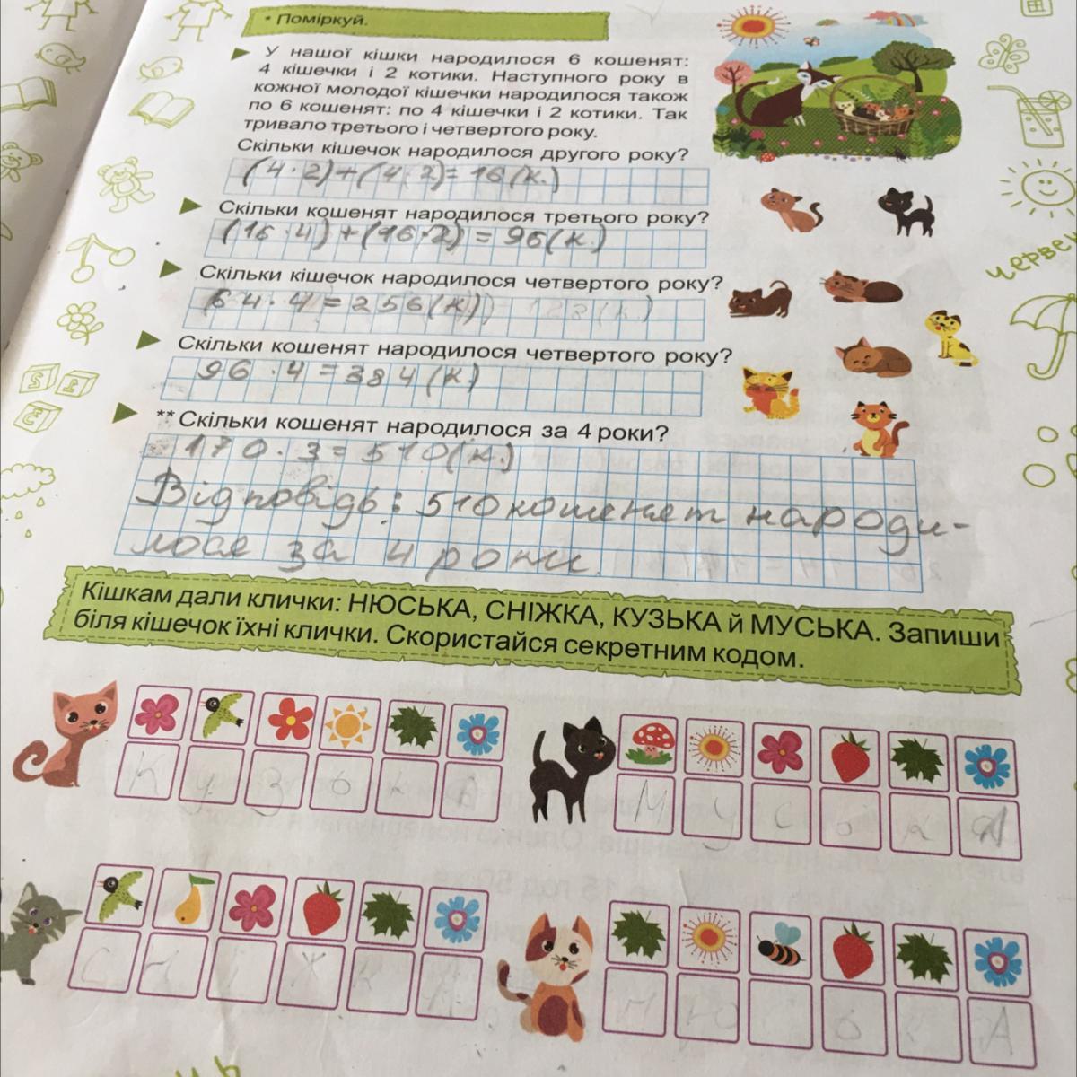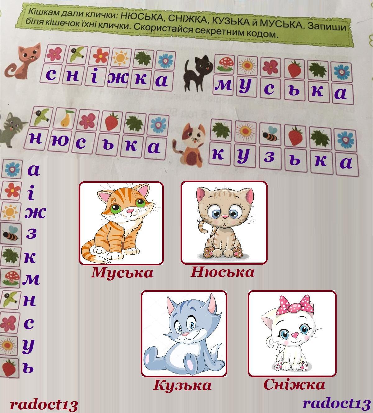 біля кішечок їхні клички. Скористайся секретним кодом.Допоможіть!!!