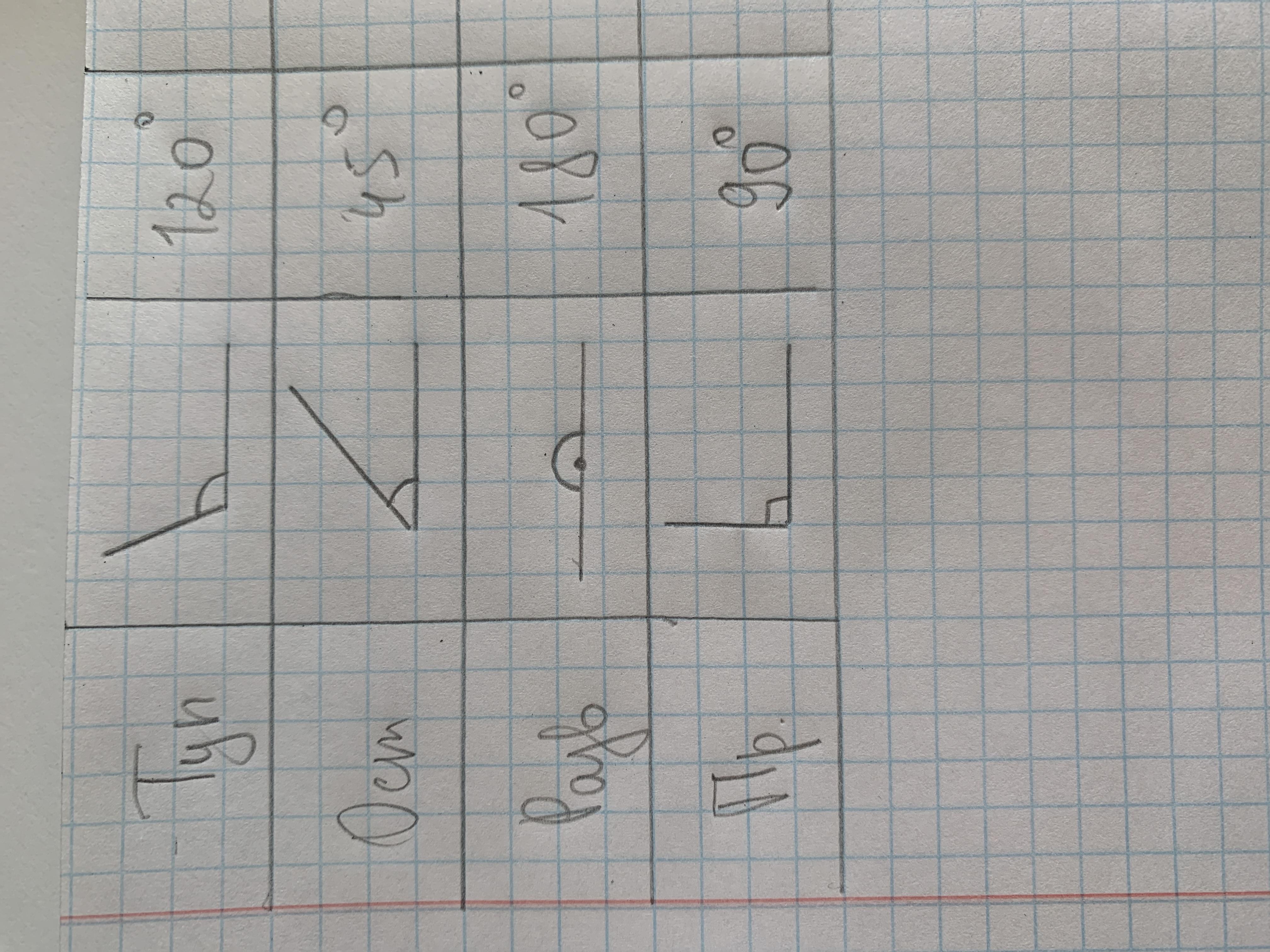 прямой угол равен 90°. Развёрнутый угол равен 180 °. Острый угол- от 0° до 90°. Тупой угол от 90° до 180°. Заполни пустые клетки таблицы (в качестве градусной меры выбери любые подходящие значения )