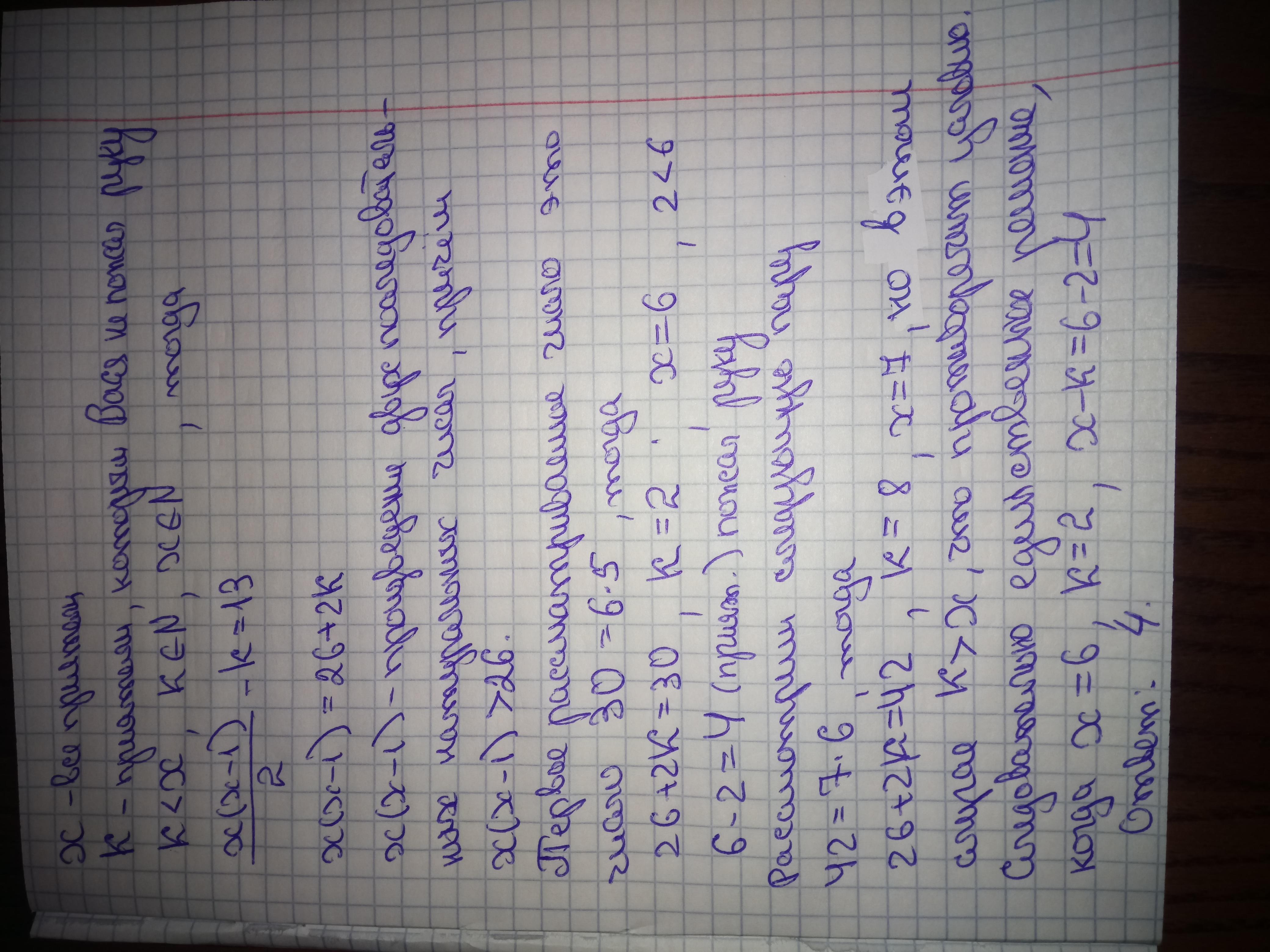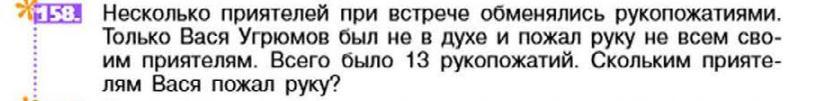 (x*(x-1))/2, типа каждый пожал руку каждому, не считая Васи, поэтому x-1, но у меня возникает вопрос, как они могли пожать руку самому себе? Поэтому мне кажется, что формула должна быть (x*(x-2))/2. Прав ли я?