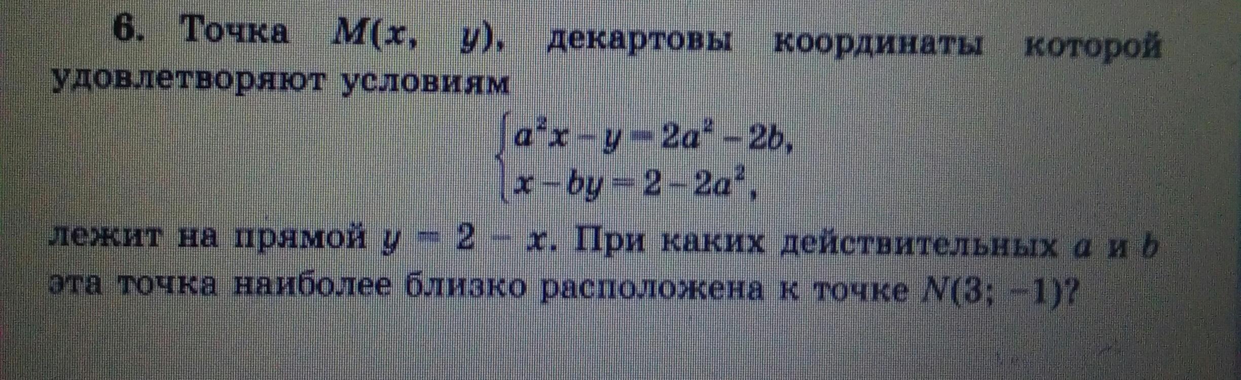 Как решить эту задачу максимально просто?????????ПОЖАлУЙСТА!! точка М(x;y), декартовы координаты которой удовлетворяют условиям a^2x-y=2a^2-2b x-by=2-2a^2 лежит на прямой y=2-x При каких действительных a Ии b Эта точка наиболее близко расположена к точке N(3;-1)