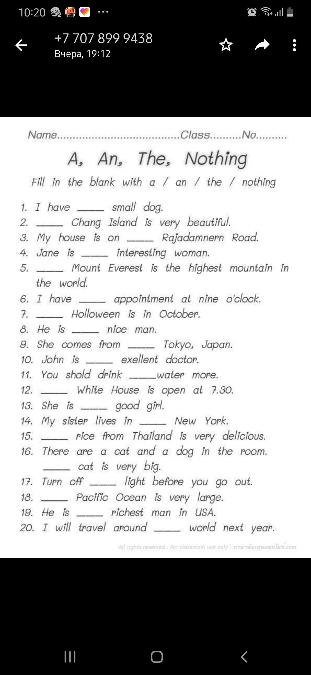 Ответ: 1 a, 2 the, 3 - (nothing, артикль не ставится вообще); 4 an; 5 the; 6 an; 7 - ; 8 a; 9 - ; 10 an; 11 - ; 12 the; 13 a; 14 - ; 15 - ; 16 the; 17 - ; 18 the; 19 the; 20 the