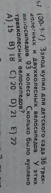завод купил для детского сада 36 трехколесных и двухколесных велосипедов в этих велосипедов 93 колеса Сколько было куплено трехколесных велосипедов ?????