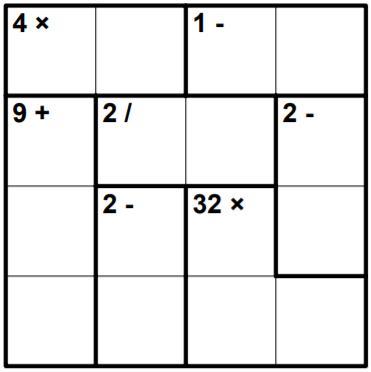 Разгадайте кендоку: заполните клетки числами от 1 до 4 включительно так, чтобы в каждой строке и в каждом столбце числа не повторялись. Число, которое записано в углу каждого выделенного блока - это результат сложения, вычитания, умножения или деления в этом блоке. Числа внутри блока могут повторяться.