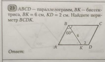 ABCD-параллелограмм; BK-биссектриса; BK=6см; KD=2см; угол ABK=60°