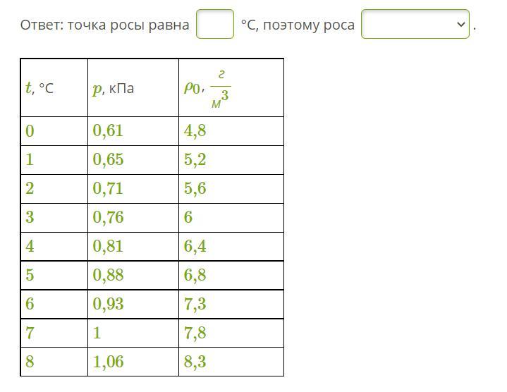 Как вы думаете, выпадет ли на траве роса при температуре воздуха 4 °С и относительной влажности 75 %? Определите точку росы, используя данные таблицы.