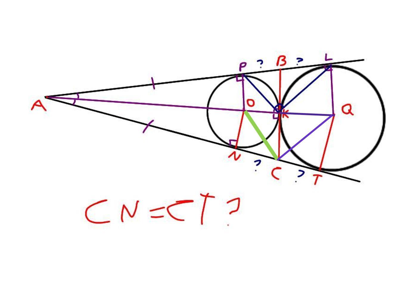 Задача : Даны две окружности ,они касаются внешним образом. Путь точка внешнего касания окружностей это точка K. И проведенны две касательные из одной точки , которые касаются к каждой окружности . Мы сделаем прямую через точку K. И были проведены радиусы . Докажите что CN=CT. Смотрите рисунок и описание к задаче.