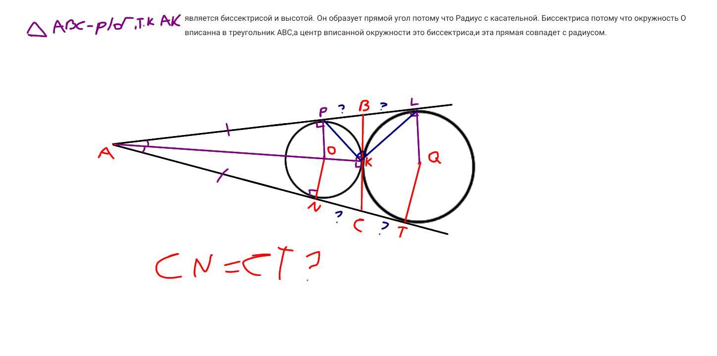 Докажите что CN=CT . Не пишите что по теореме о отрезках касательных. Я не вижу или не понимаю ,это теорема говорит то что AP=AN ,но я не вижу как она взаимодействонна с CT и CN. Зная это я смогу доказать что CT=CN=CK,по свойству медианы прямоугольного треугольника, проведённая из вершины прямого угла.Так как CK медиана проведённая из вершины прямого угла. Дело не в этом ,я не вижу что CN=CT. Не разумные пожалуйста не отвечайте на этот вопрос как , свойство отрезков касательной,без доказательства к рисунку,или есть ещё хуже что отвечают что нет условия и задача так себе. И удаляют вопрос .