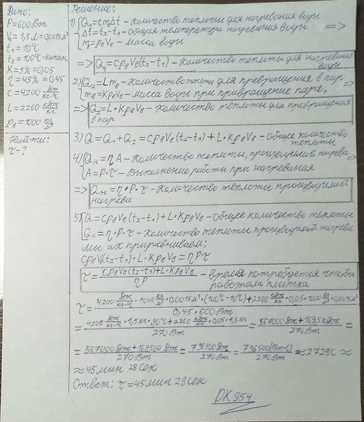 Так какой объем воды кипятили при 600 Вт плитке? У вас в условий написано что кипятили 1,5 л 10 л воды. Какой именно его объем воды?