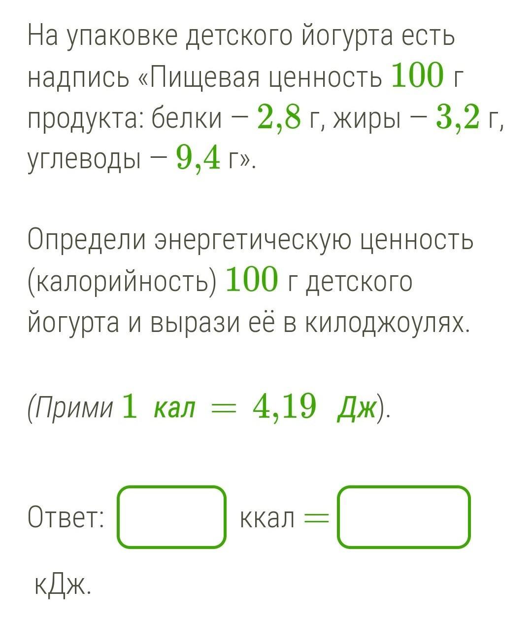 На упаковке детского йогурта есть надпись «Пищевая ценность 100 г продукта: белки — 2,8 г, жиры — 3,2 г, углеводы — 9,4 г». Определи энергетическую ценность (калорийность) 100 г детского йогурта и вырази её в килоджоулях. (Прими 1 кал = 4,19 Дж). Ответ: ккал = кДж.