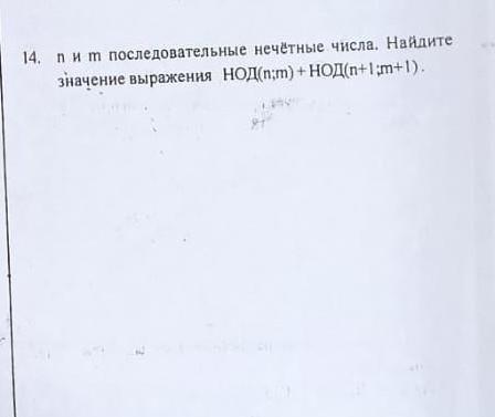 n=2k+1 , m= 2k+3 , Нод(nm)= (2k+1)(2k+3) , 2к+1+1= 2к+2 , 2(к+1 ) 2к+4, 2(к+2 ) Нод(n+1,m+1,)=2(к+1)(к+2), Нод(nm ) + НОД n+1,m+1)= (2к+1)(2к+3)+2(к+1)(к+2)= 6к²+14к+7. Может быть так.