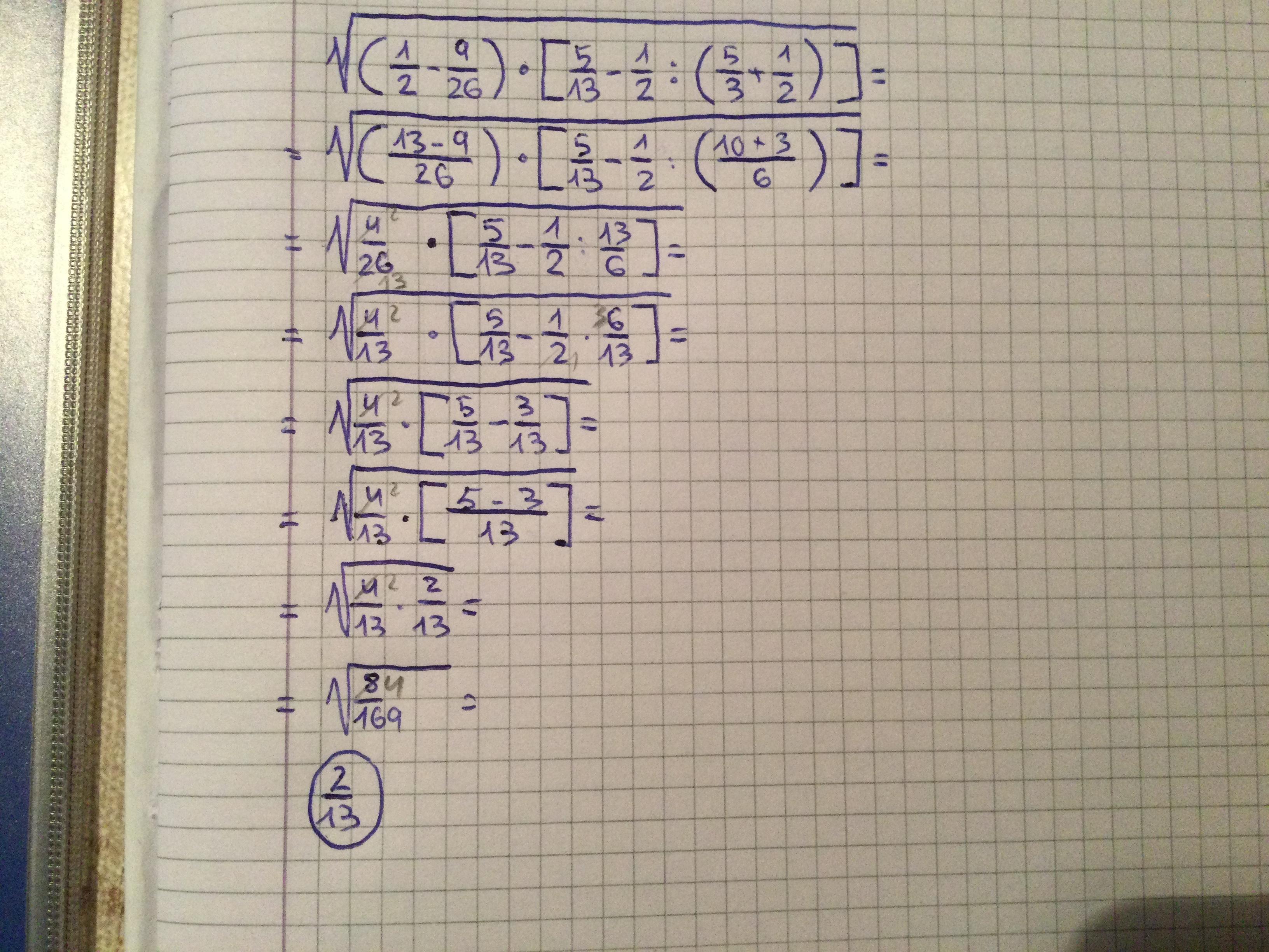 (1/2-9/26)*[5/13-1/2:(5/3+1/2)] = ? (Все это в квадратном корне)