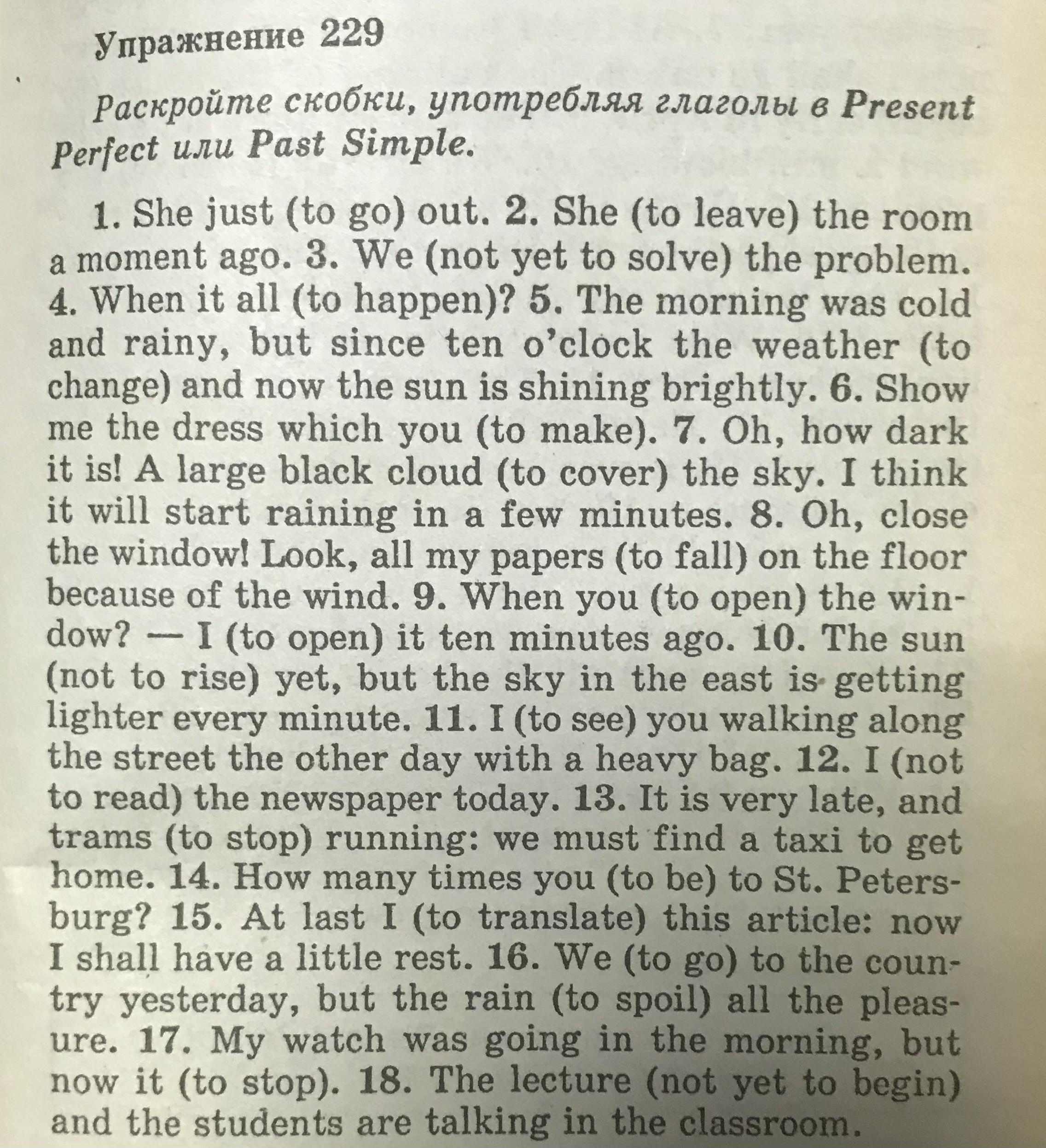 1.She has just gone out. 2.She left a room a moment ago. 3.We haven't solved the problem yet. 4.When it all happened? 5. ...the weather has changed and... 6. ...which you have made. 7. ...cloud has covered... 8. ...papers have fallen... 9.When did you open the window? - I opened it ten minutes ago. 10. The sun hasn't risen yet, but... 11. I saw you... 12.I didn't read... 13. ...trams have stopped running... 14. How many times have you been.... 15. ...I have translated... 16. We went... but the rain spoiled. 17. ...now it stopped. 18. The lecture hasn't begun yet and....