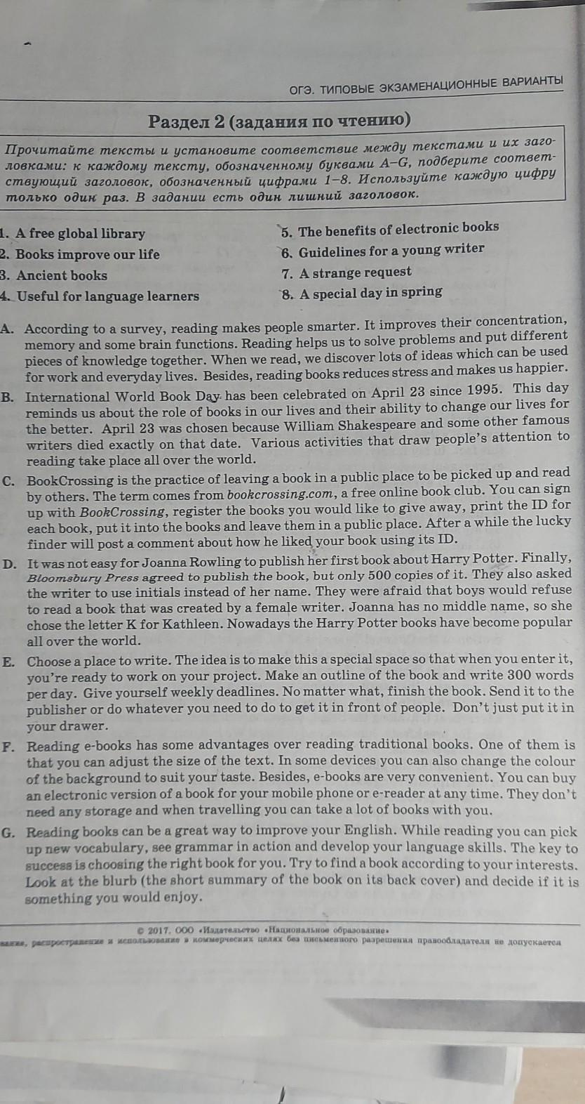 1. A free global library 5. The benefits of electronic books 2. Books improve our life 6. Guidelines for a young writer 3. Ancient books 7. A strange request 4. Useful for language learners 8. A special day in spring A. According to a survey, reading makes people smarter. It improves their concentration, memory and some brain functions. Reading helps us to solve problems and put different pieces of knowledge together. When we read, we discover lots of ideas which can be used for work and everyday lives. Besides, reading books reduces stress and makes us happier. B. International World Book Day has been celebrated on April 23 since 1995. This day reminds us about the role of books in our lives and their ability to change our lives for the better. April 23 was chosen because William Shakespeare and some other famous writers died exactly on that date. Various activities that draw people's attention to reading take place all over the world. c. BookCrossing is the practice of leaving a book in a public place to be picked up and read by others. The term comes from bookcrossing.com, a free online book club. You can sign up with BookCrossing, register the books you would like to give away, print the ID for each book, put it into the books and leave them in a public place. After a while the lucky finder will post a comment about how he liked your book using its ID. D. It was not easy for Joanna Rowling to publish her first book about Harry Potter. Finally, Bloomsbury Press agreed to publish the book, but only 500 copies of it. They also asked the writer to use initials instead of her name. They were afraid that boys would refuse to read a book that was created by a female writer. Joanna has no middle name, so she chose the letter K for Kathleen. Nowadays the Harry Potter books have become popular all over the world. E. Choose a place to write. The idea is to make this a special space so that when you enter it, You're ready to work on your project. Make an outline of the book and write 300 words