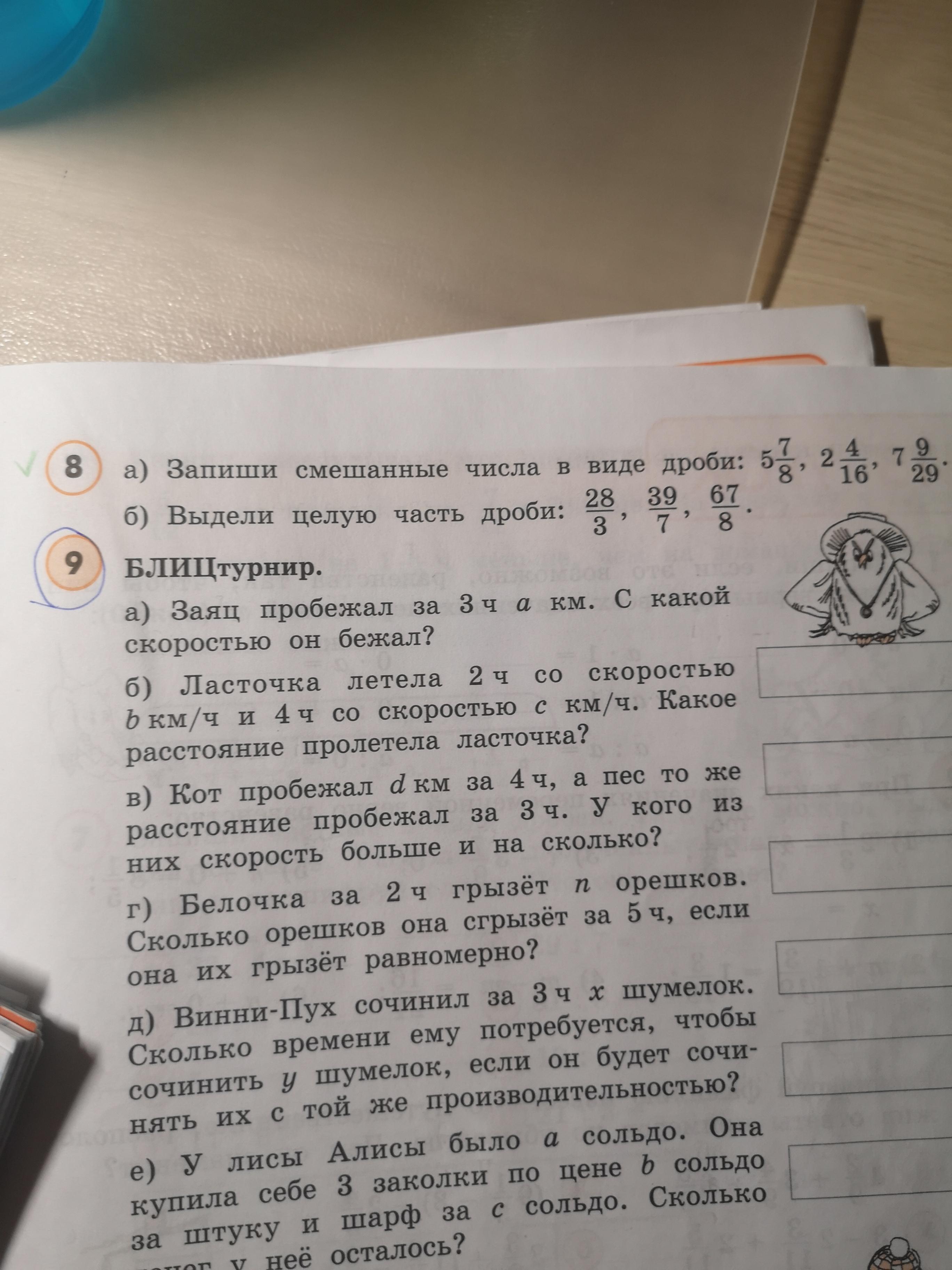 Номер 8 а) запиши смешанные числа в виде дроби: 5 7, 8 2 4, 16 7 9,29 б) выдели целую часть дроби: 28,3 39,7 67,8