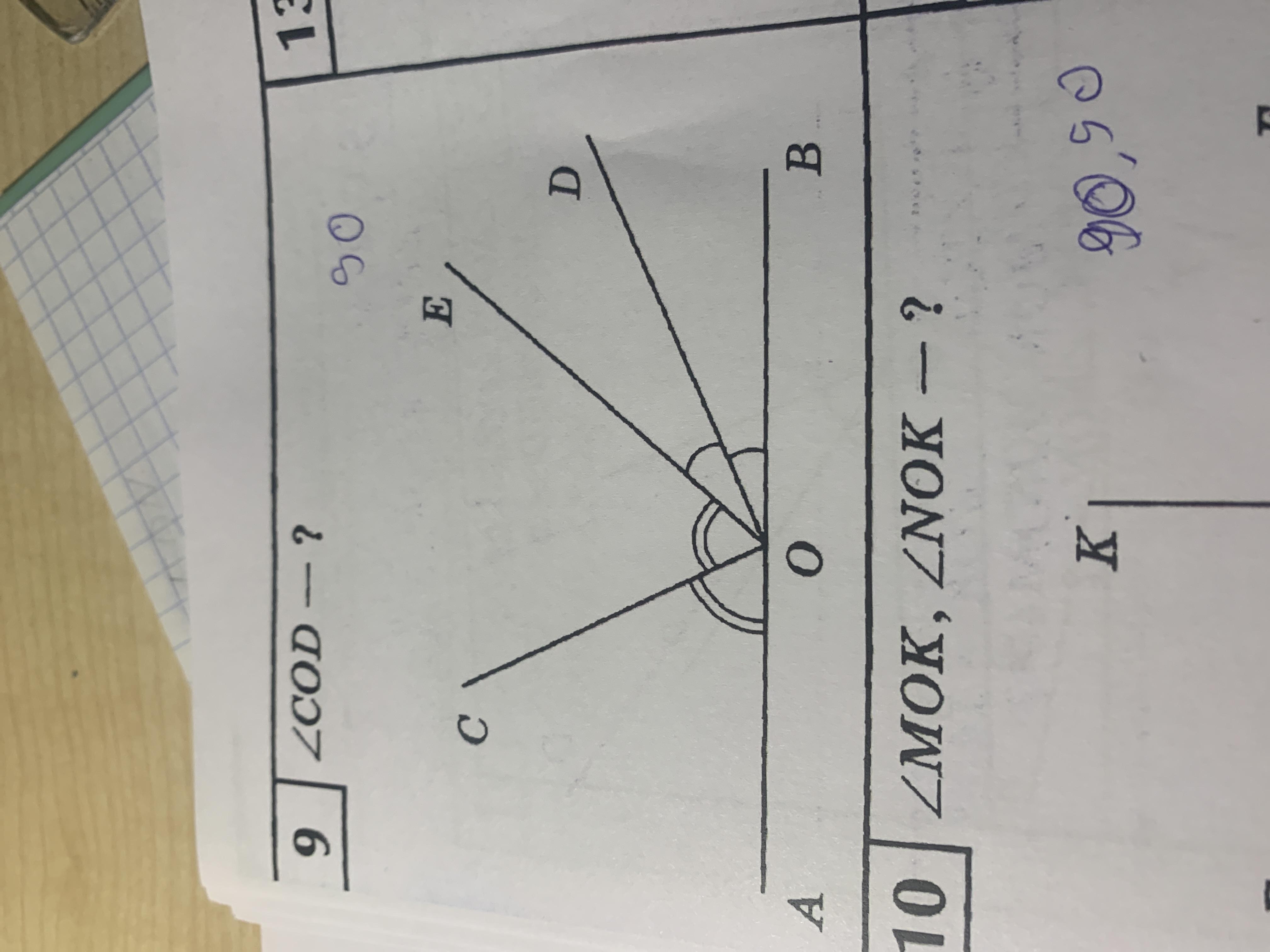 Смотри у тебя весь нарисованный угол AOB равен 180 градусам, а углы AOC и COE равны между собой и углы EOD и DOB тоже равны между собой. Получается что серединный угол COD который нас просят найти составлен из углов COE и EOD , у которых есть парные равные углы ( они отмечены одинаковым кол-вом дуг ). Получается у нас образуется две пары с равными в них углами. И тут просто нужно посчитать 180/2 = 90 вот и всё.