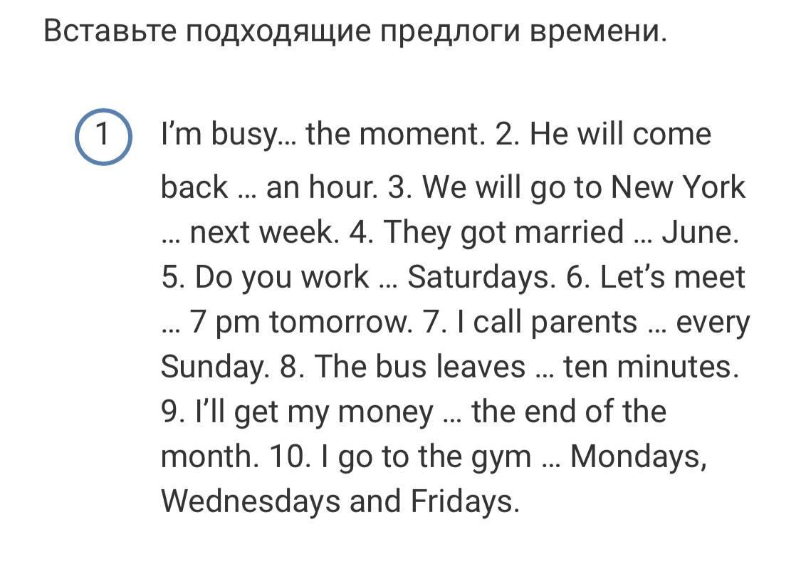 1 at; 2 in; 3 – (без предлога); 4 in; 5 on; 6 at; 7 – ; 8 in; 9 at; 10 on
