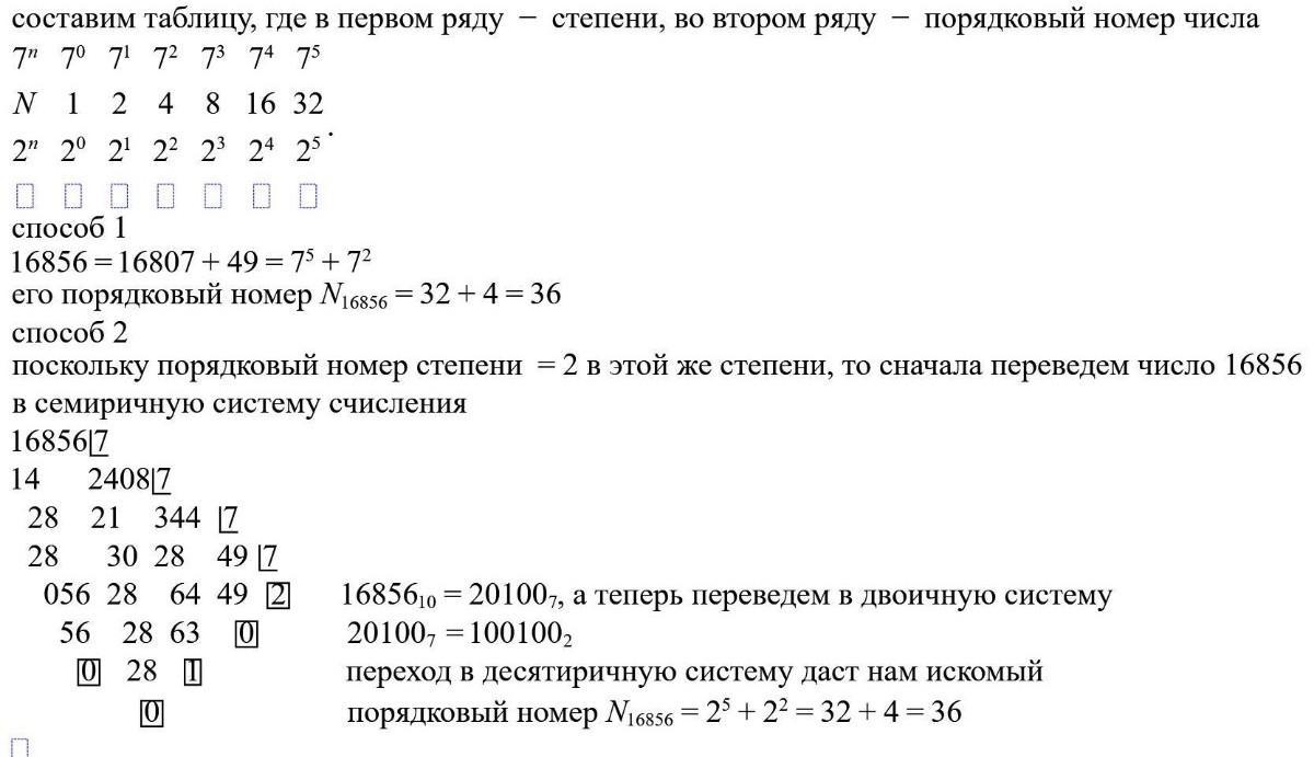 6856 переводим в семиричную систему счисления: 16856(7) = 100100(7), а поскольку нас интересуют только суммы одиночных степеней, то нас интересуют числа с комбинациями нулей и единиц. Если разместить эти числа в порядке возрастания в один ряд и записать их теми же цифрами, но в двоичной системе счисления и перевести их снова в десятичную, то получим порядковый номер члена: 100100(2) = 36(10) . То есть на 36 месте