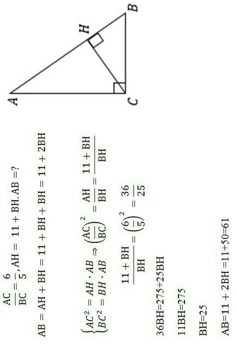 Висота прямокутного трикутника, проведена з вершини прямого кута, ділить гіпотенузу на відрізки, один з яких на 11 см більше іншого. Знайдіть гіпотенузу трикутника, якщо катети трикутника відносяться як 6:5