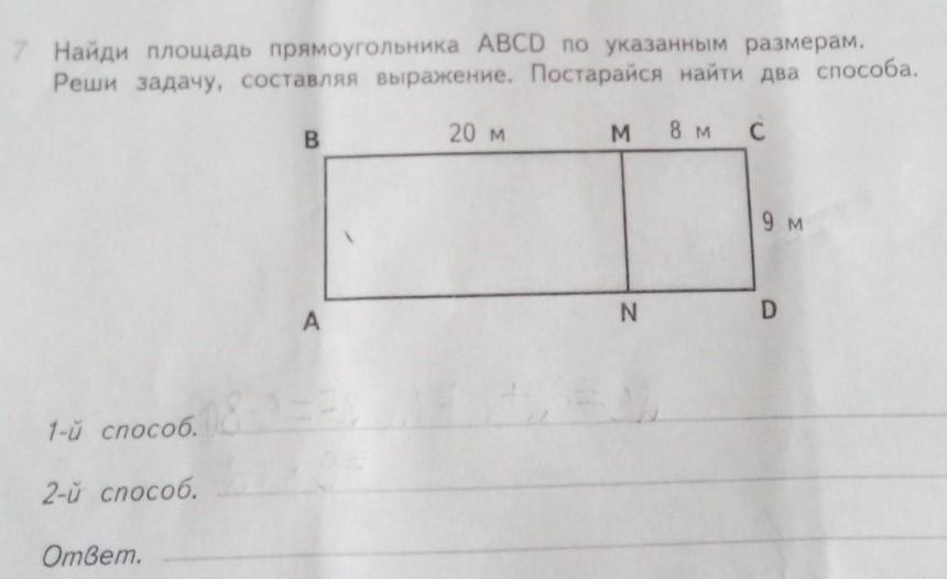 1) S ABCD = ВС * CD 2) BC = BM + MC = 20 + 8 = 28 (м) 3) 28 * 9 = 252 (кв.м)