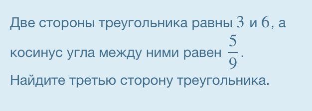 за теоремой косинусов в произвольном треугольнике третья сторона = корень из (9+ 36 - 2*3*6*5/9) = корень из (45 - 20) = корень из 25 = 5 см