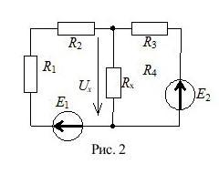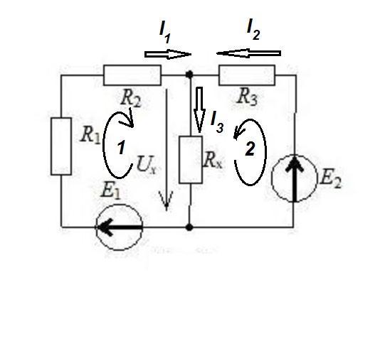 Определите напряжение Ux, если R1= 1 Ом, R2= 3 Ом, R3= 4 Ом, Rx = 4 Ом, E1 = 3 В, Е2 = 6 В.
