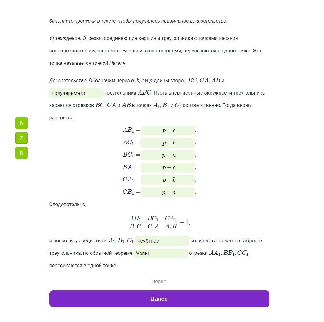 и поскольку среди точек A1, B1, C1 ________ количество лежит на сторонах треугольника, по обратной теореме _______ отрезки AA1, BB1, CC1 пересекаются в одной точке.