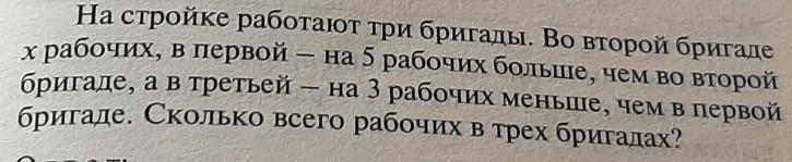 6. Составьте выражение по условию задачи и упростите его. На стройке работают три бригады. Во второй бригаде х рабочих, в первой — на 5 рабочих больше, чем во второй бригаде, а в третьей – на 3 рабочих меньше, чем в первой бригаде. Сколько всего рабочих в трех бригадах?