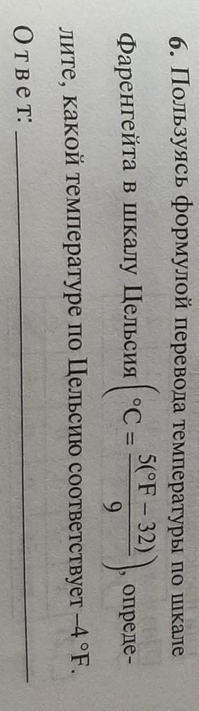 6. Пользуясь формулой перевода температуры по шкале 5(°F - 32):9 Фаренгейта в шкалу Цельсия | °C опреде- (с. какой температуре соответствует -4градуса по фарнгейту