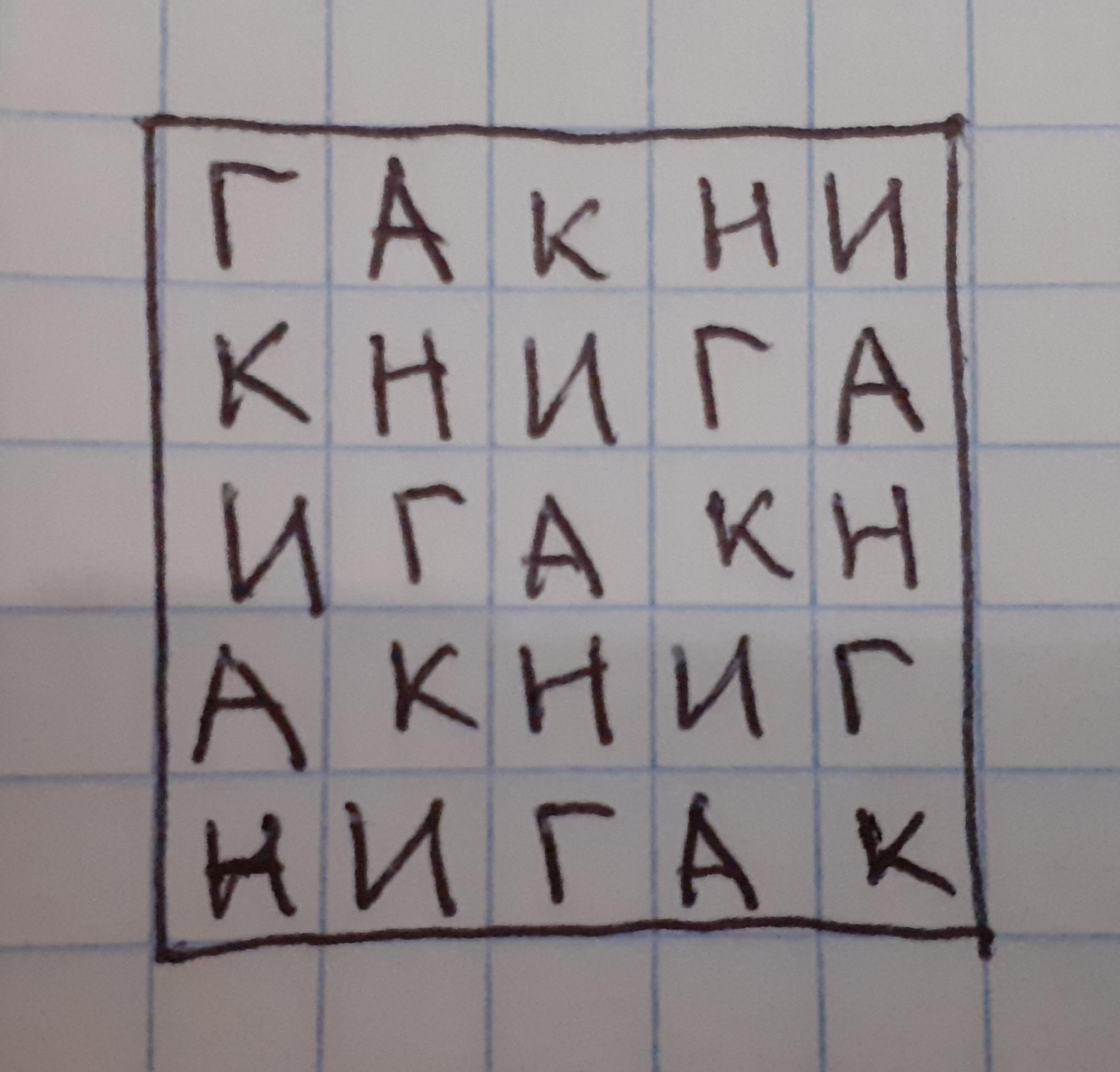 Вставь в пустые клетки буквы слова "Книга" так, чтобы в строках, столбцах и по диагонали буквы не повторялись. Квадрат 5×5.