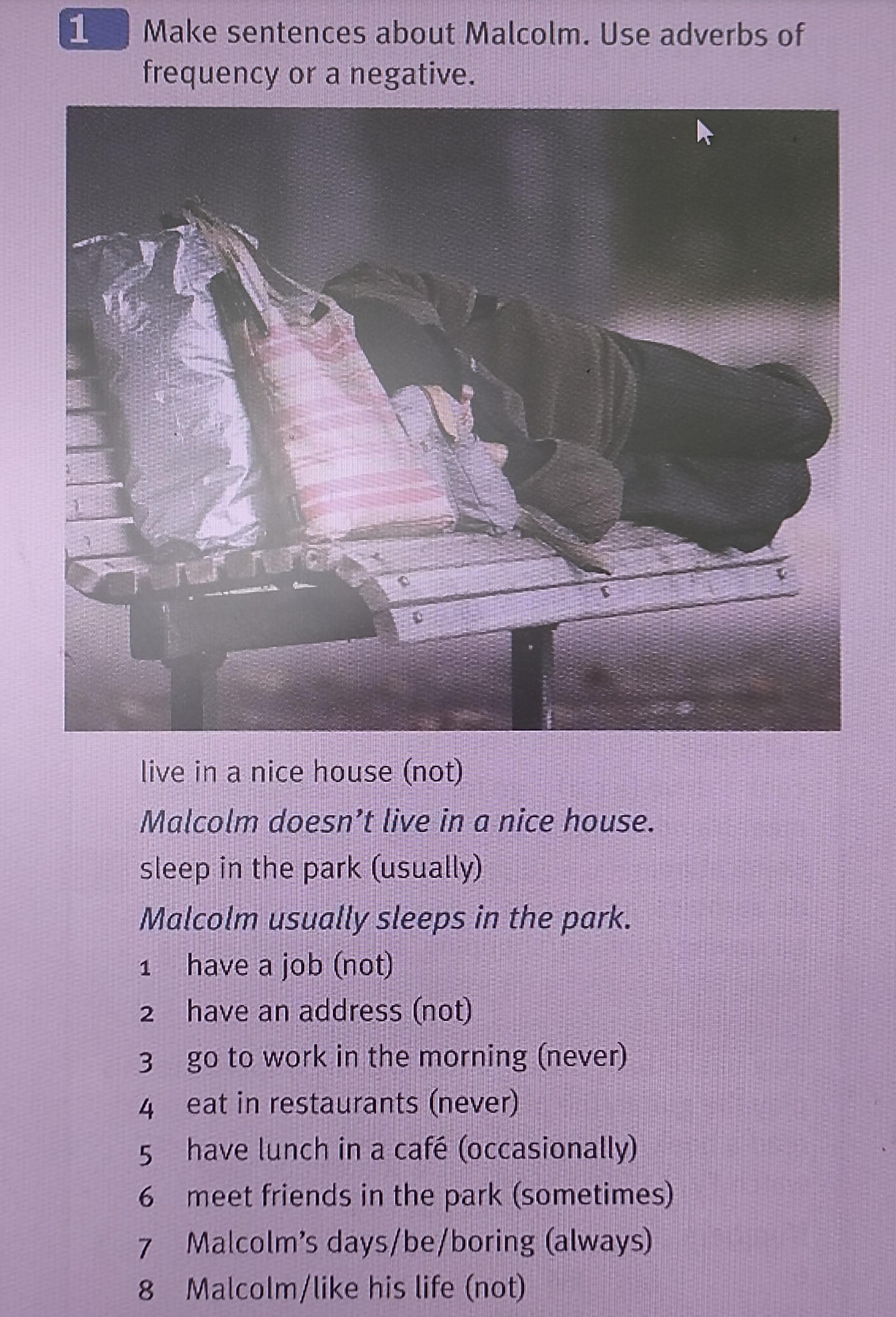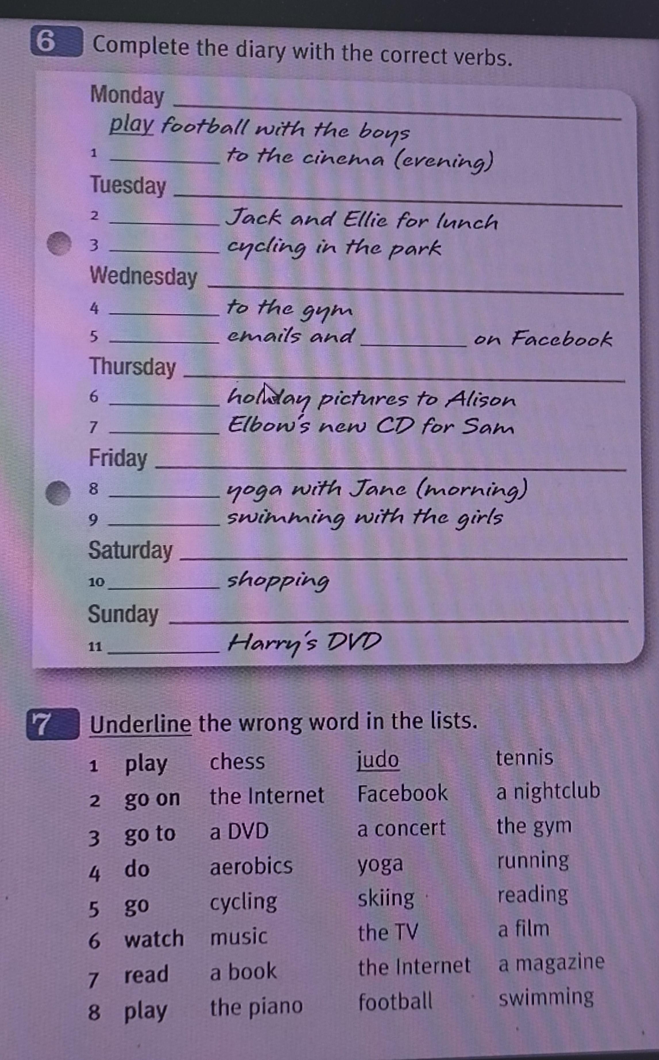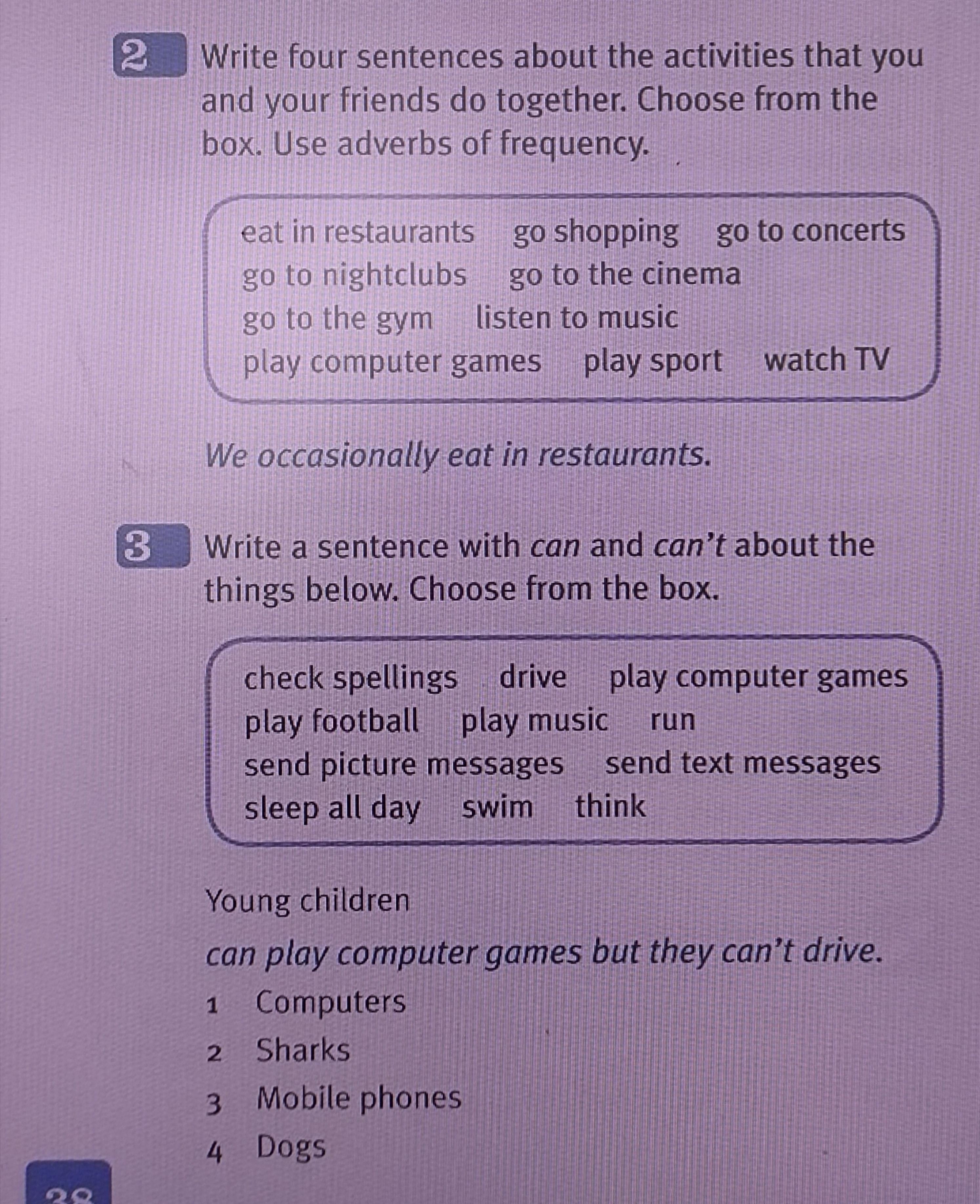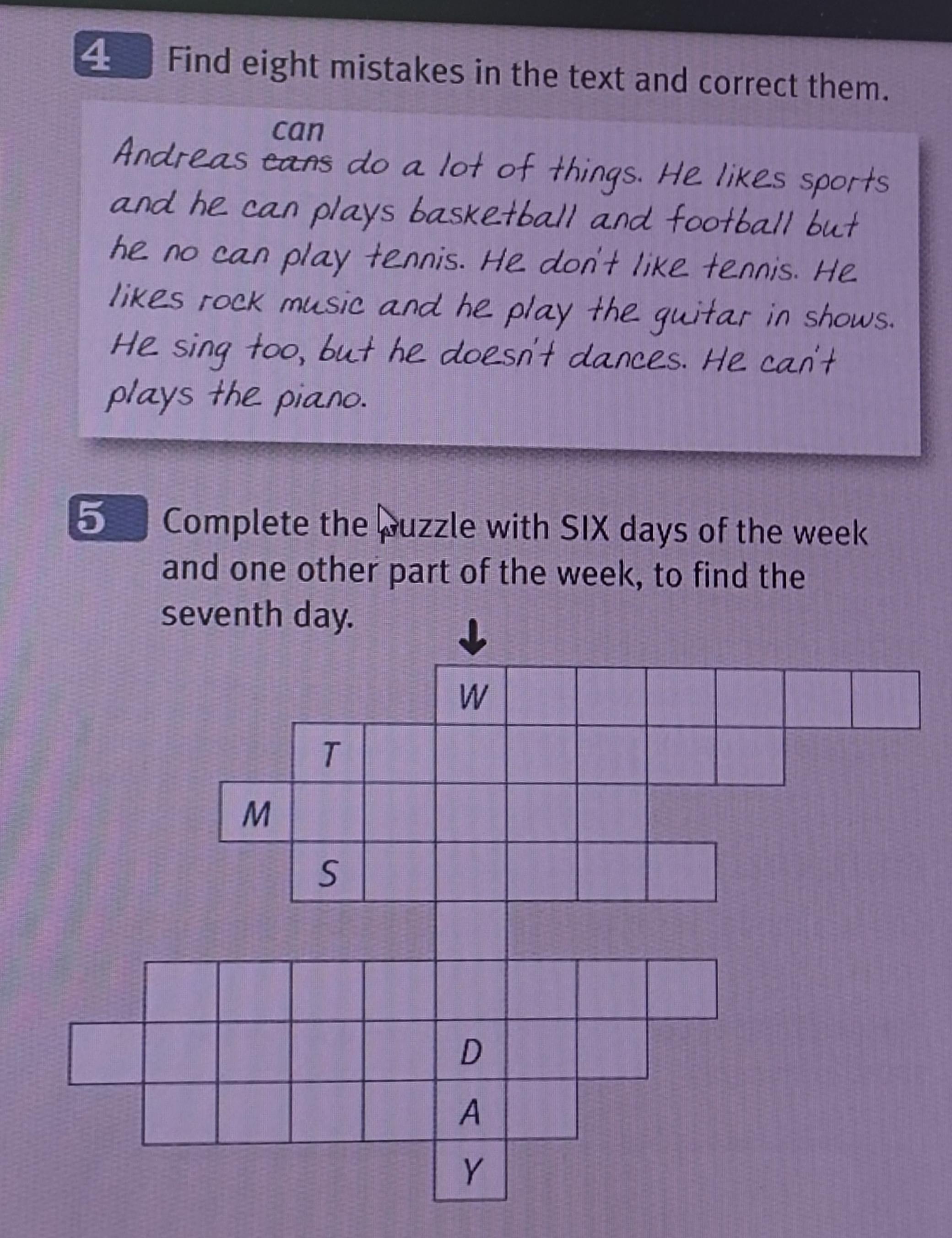He likes sports and he can PLAY basketball and football, but he CAN'T play tennis. He DOESN'T like tennis. He likes rock music and he PLAYS the guitar in shows. He SINGS too, but he doesn't DANCE. He can't PLAY the piano.