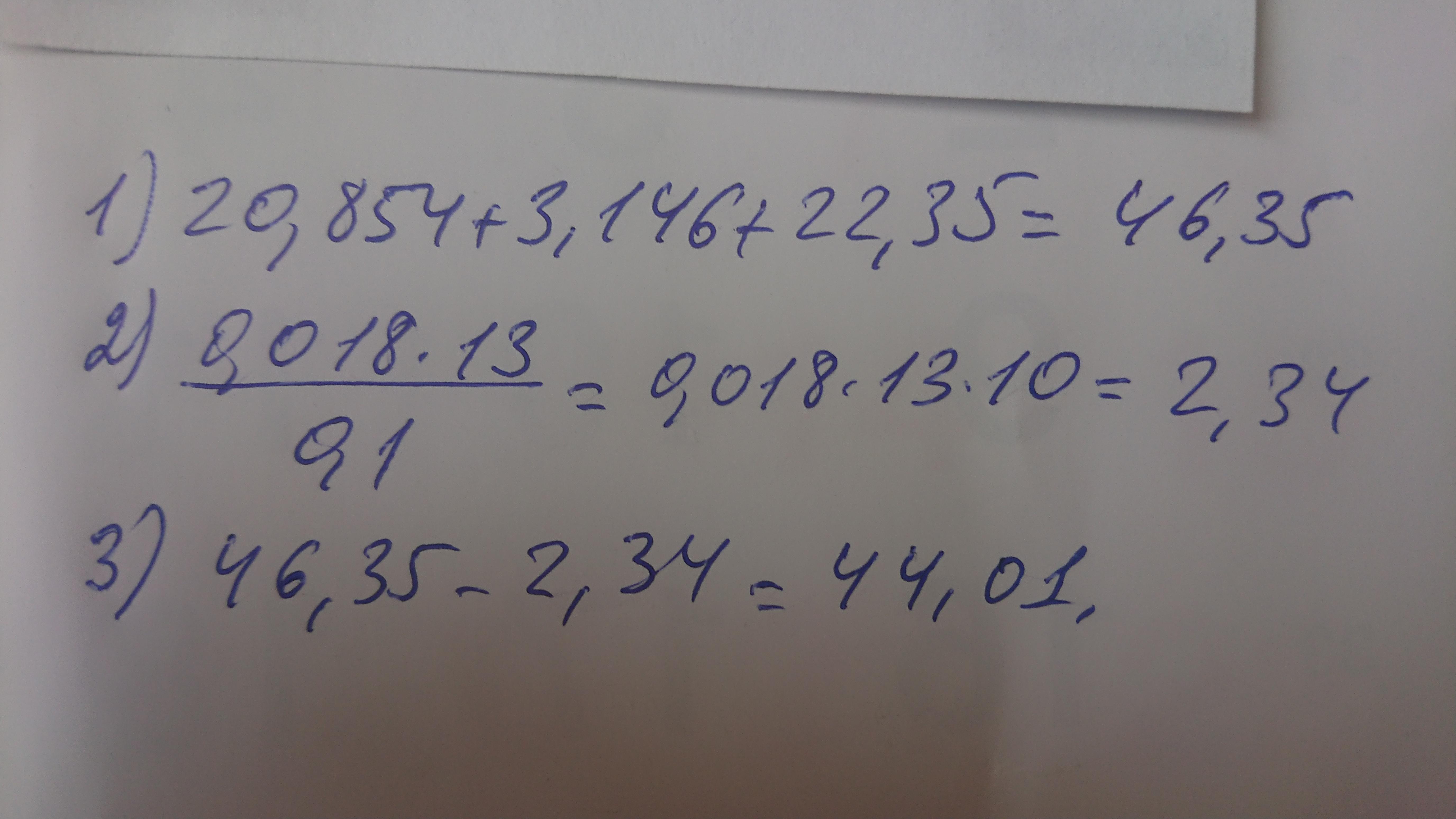 20,854 + 3,146 - 0,018 · 13 : 0,1 + 22,35 = 44,01