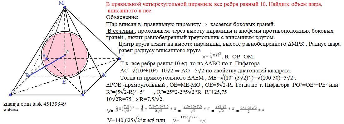 В правильной четырехугольной пирамиде все ребра равный 10. Найдите объем шара, вписанного в нее