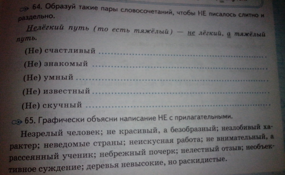 64: левый столбик слитное написание-правый раздельное.Можно еще так:несчастливый(то есть грстный)-не очень счасливый финал и т.д.