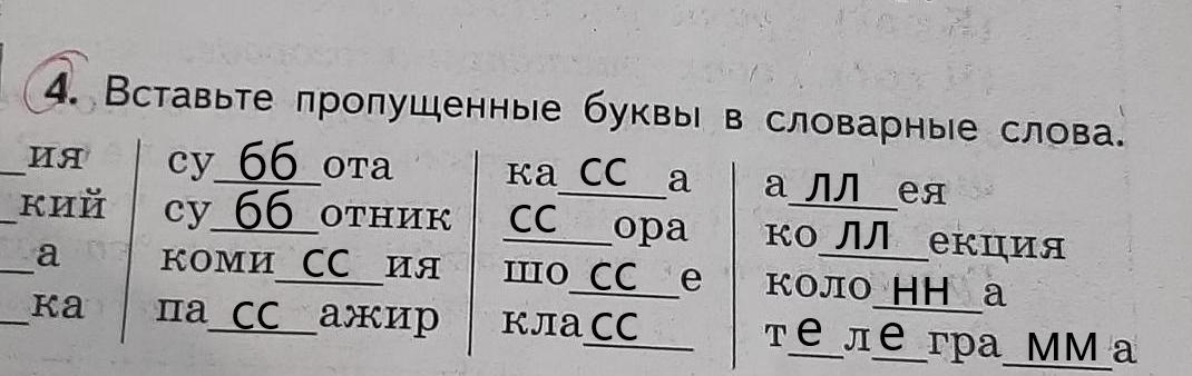 Суббота, субботник, комиссия, пассажир, касса, ссора, шоссе, класс, аллея, коллекция, колонна, телеграмма.