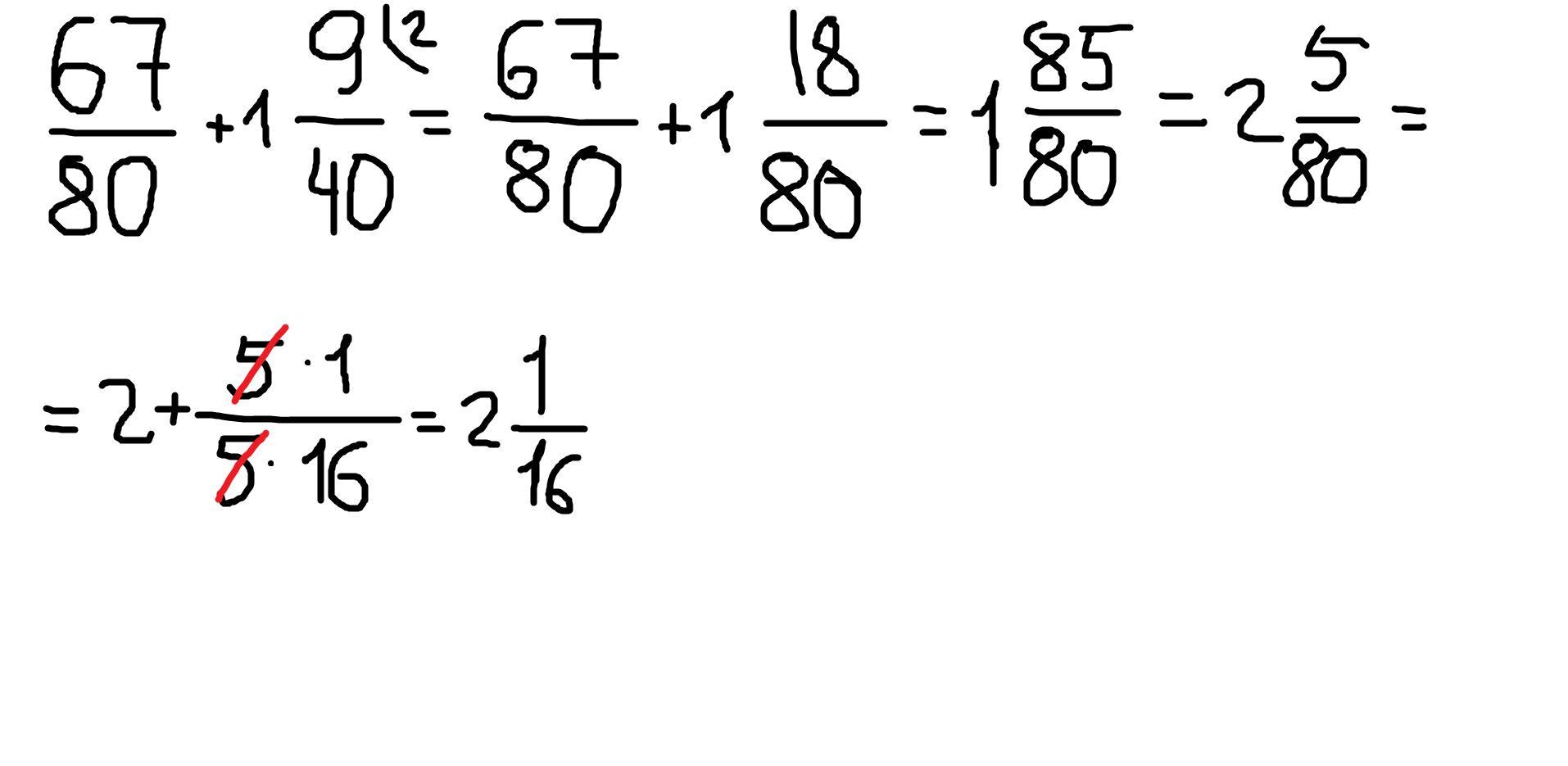 Ответ: 67/80 + 1 9/40=67/80+1 18/80=1+85/80=1+1 5/80=1+1 1/16=2 1/16.