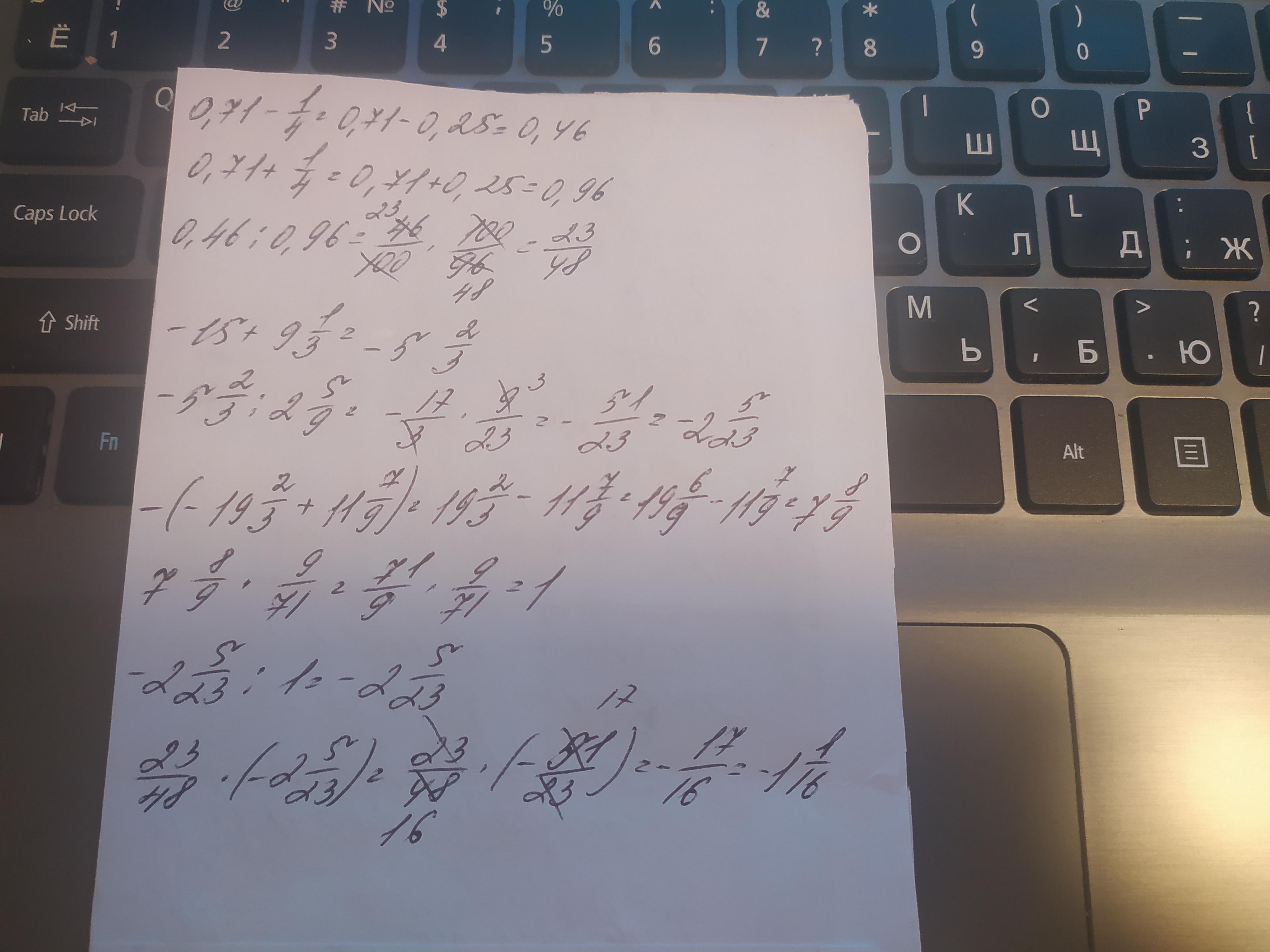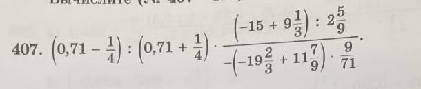 (0,71-1/4) : (0,71+1/4) * ((-15+9 1/3) : 2 5/9)) : ((-(-19 2/3 + 11 7/9) * 9/71)) = -1 1/16