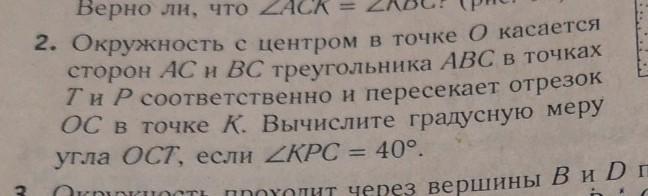 Окружность с центром в точке О касается сторон АС и ВС в ночках Т и Р соответственно и пересекает отрезок ОС в точке К. Вычислите градусную меру угла ОСТ , если ∠КРС=40°