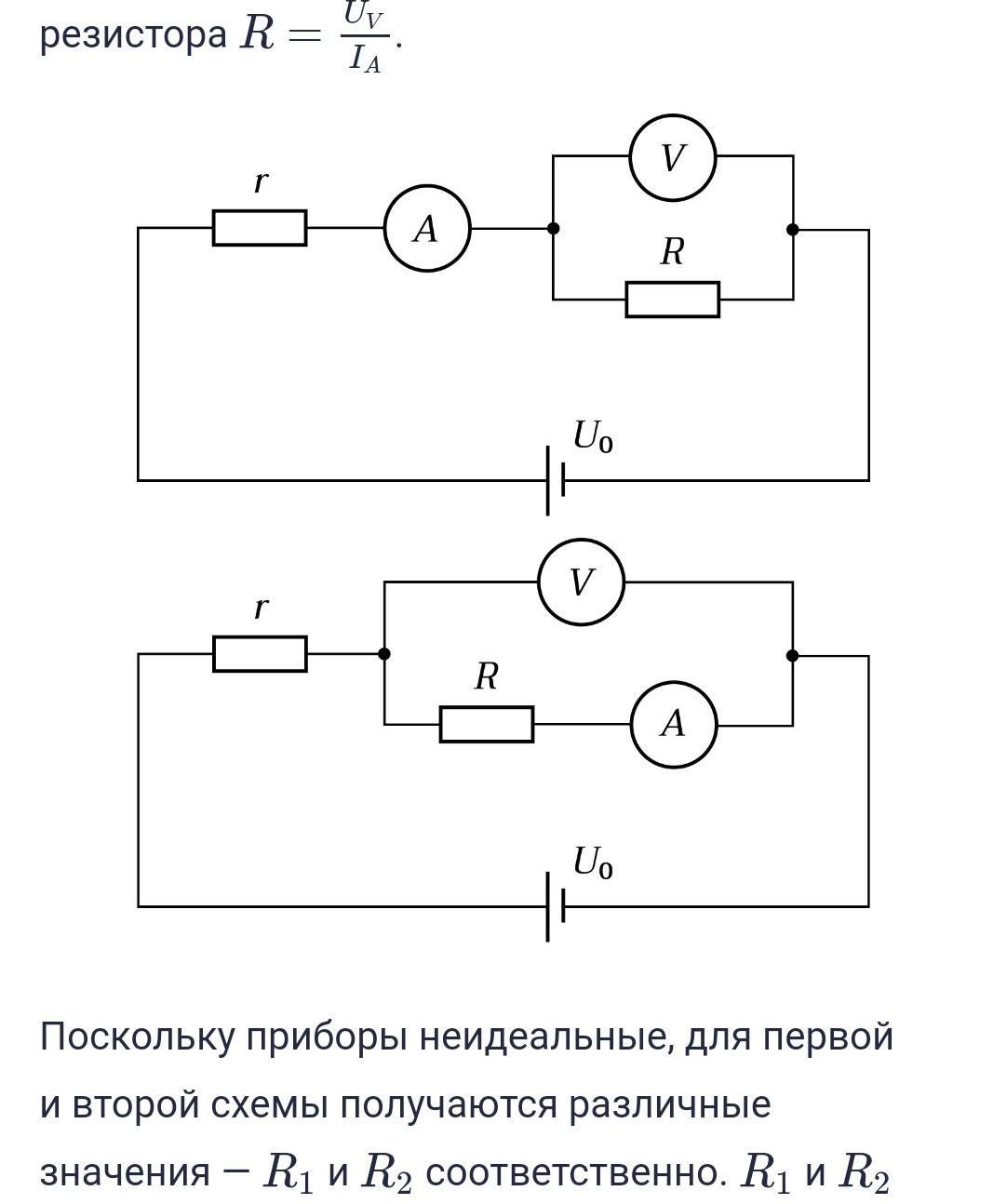 1.) Из одинаковых компонентов собрали две схемы, как показано на рисунке. Параметры схем: U0=4, r=1 Ом. Сопротивления приборов: RA=4 Ом, RV=1,6 кОм. Для каждой схемы, разделив показания вольтметра на показания амперметра, определяют сопротивление резистора R=UV/IA. Поскольку приборы неидеальные, для первой и второй схемы получаются различные значения — R1 и R2 соответственно. R1 и R2 можно рассматривать как результат измерения R, полученный в каждом случае с разной степенью точности. Вычислите R1 и R2, предполагая, что истинное значение R равно 400 Ом. Ответы выразите в омах, округлите до целых чисел. R2 На сколько процентов R1 и R2 отличаются от R соответственно? Ответы округлите до целых чисел.
