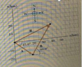 Путешественник проходит 20,0 км (вектор A) под углом 45 к юго-востоку в первый день и 30,0 км (вектор B) под углом 60,0 к северо-востоку во второй день. Как далеко путешественник продвигается по оси x-y в первый и второй день?