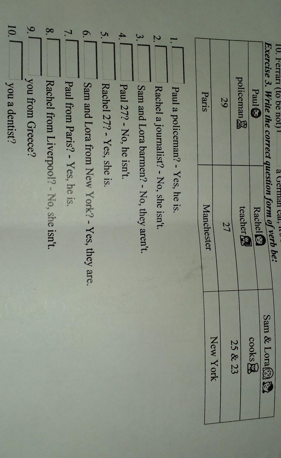 В заданиях с 1 по 8 подсказка дана в самом задании. Глагол, который дается в ответе, нужно употребить в той же форме и в вопросе. Где is/isn't там is, где are/aren't там are. Вопрос ко второму лицу всегда задается с глагола Are.