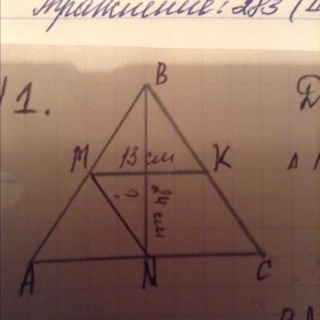 Помогите решить задачу! Средняя линия равнобедренного треугольника параллельная основания равна 13 см, а биссектриса проведенная к основанию равна 24 см. Найти среднюю линию параллельную боковой треугольника.