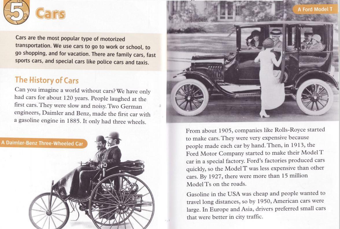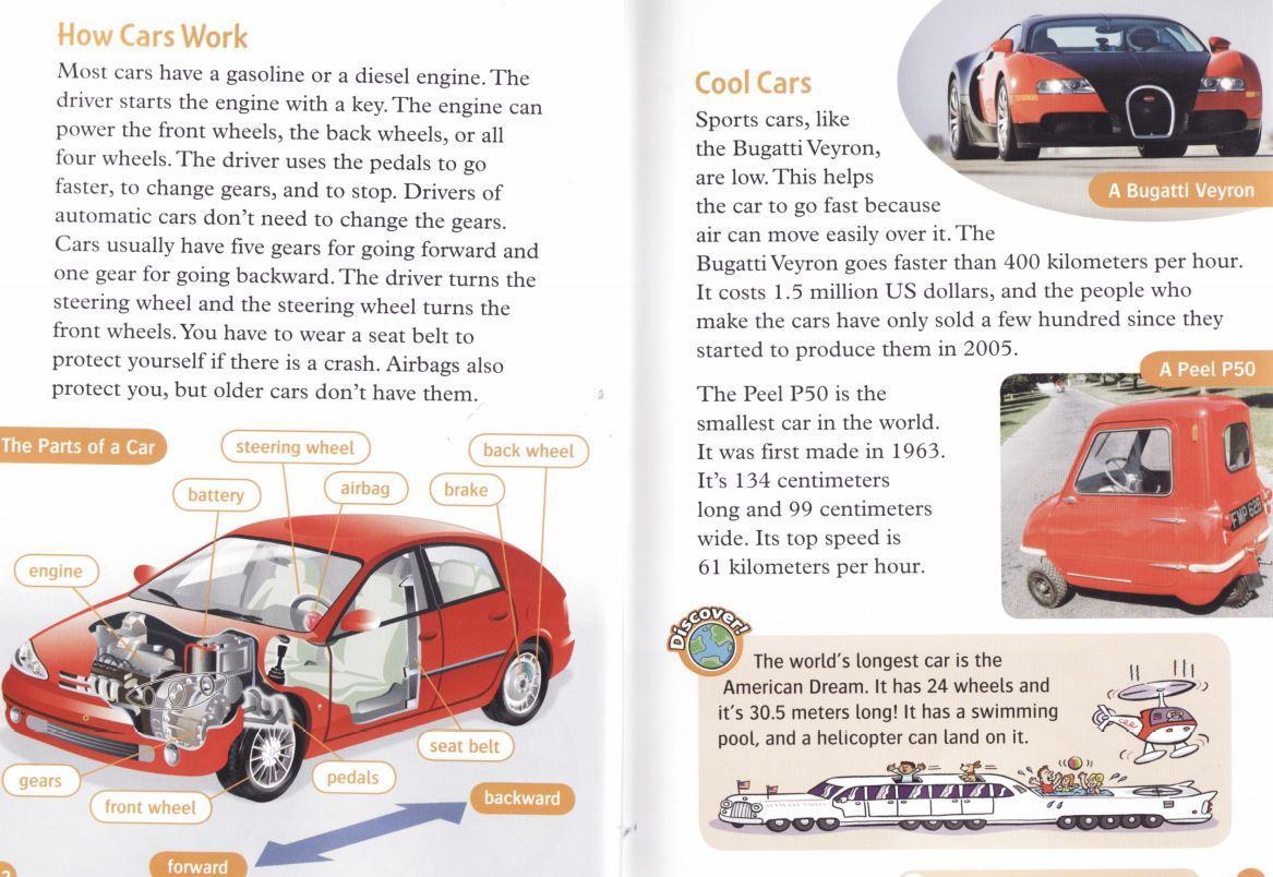 We have only had cars for about 120 years and they were so slow and noisy. Two German engineers made the first car in 1885, it only had 3 wheels. Companies like Rolls-Royce were very expensive because people made each car by hand. In 1913 the Ford Motor Company started to make their cars in a special factory and they were less expensive than other cars. So by 1950 American cars were large but in Europe and Asia drivers preferred small cars. Most cars have a gasoline or a Diesel engine. The driver starts the engine with a key and the engine can power the front, the back or all four wheels. The driver uses the pedals to go faster, to change gears, and to stop. Cars usually have five gears for going forward and one gear for going backward. You have to wear a seat belt to protect yourself if there is a crush. Sports car are low. This helps the car to go fast because air can move easily over it. Bugatti Veyron goes faster than 400 kilometers per hour and cost 1.5 million US dollars. The Peel P50 is the smallest car in the world. It was first made in 1963 and is 134 centimeters long and 99 centimeters wide, its top speed is 61 kilometers per hour.